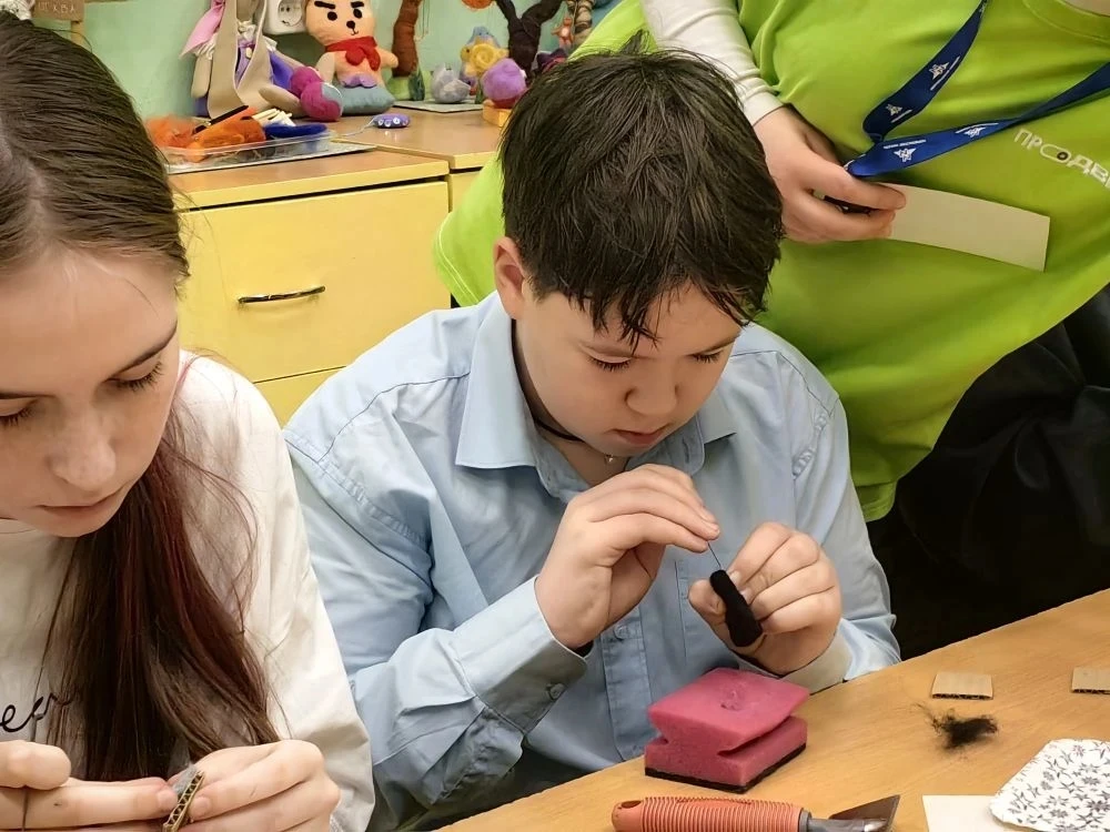 Сегодня на нашей площадке собрались целых плюс 50 активных участников профессиональных погружений из МБ(А)ОУ «СШ № 13, 28, 21, 20, 9, 14, 31, 43, Лицея № 3, Гимназий № 4 и № 1. Здесь кипит жизнь, слышится шум машинок у швей, звонкое трение напильников у столяров, тонкая работа операторов лазерного станка, восхищённые восклицания пирографов и громкие голоса event-менеджеров, активно проводящих рекламные кампании. Но особую атмосферу создают наши фелтмейкеры: под приятную музыку они тихо и сосредоточенно превращают шерсть в очаровательные мягкие украшения.